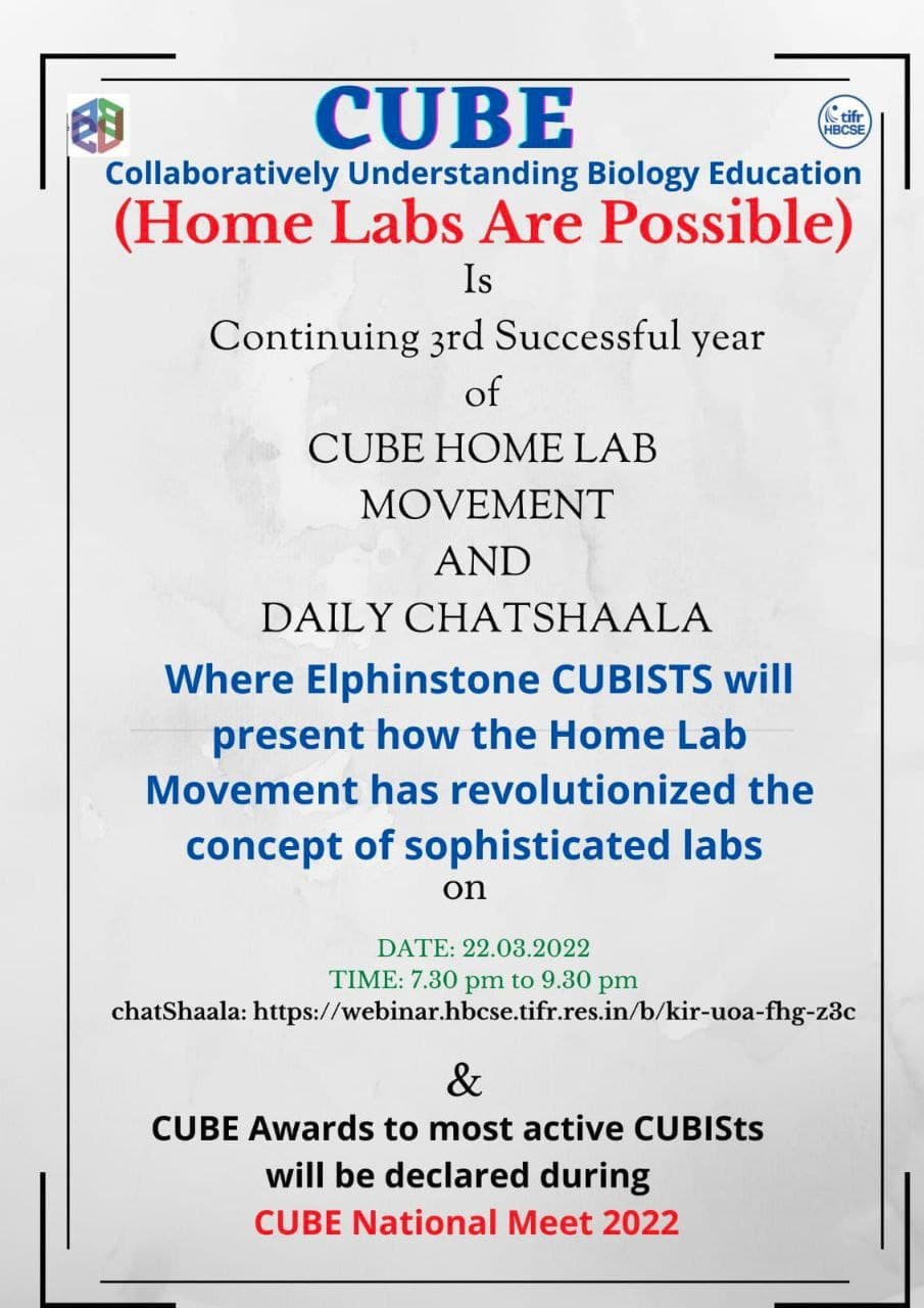 CUBE entered into its 3rd year of continuation of Home Lab movement, on this occasion an event was planned to celebrate Home Labs with presentations by Cubists of Elphinstone college, Mumbai. Several model systems like Earthworm, Hydra, Fruit Fly, Moina, Phyllanthus and so on were presented by Cubists, and it was presentated how these model systems can be cultured without much sophistication in Home Labs, and several topics of biology can be understood, studied and researched using them.